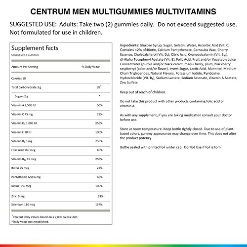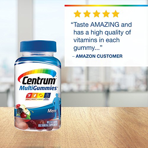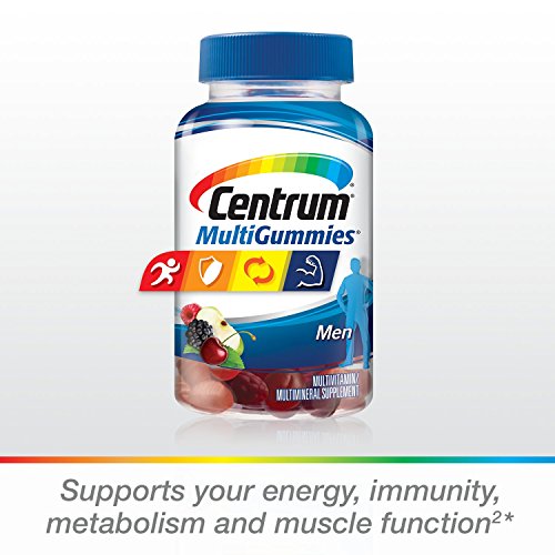 Centrum MultiGummies Men are specially formulated for men in a great-tasting and convenient gummy multivitamin. With more Vitamin D3 than any other gummy,(1) Centrum MultiGummies Men provide key nutrients that help support your energy, immunity, metabolism(2), muscle function(6) and whole body health.* They're gluten-free and have no artificial flavors or sweeteners; with three natural flavors: Berry, Cherry, and Apple. Most recommended, most studied, most preferred multivitamin brand.