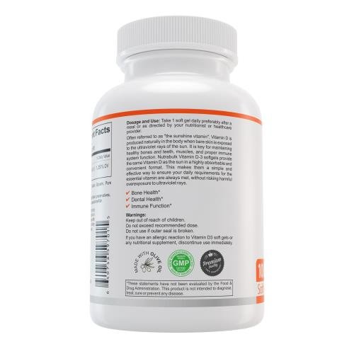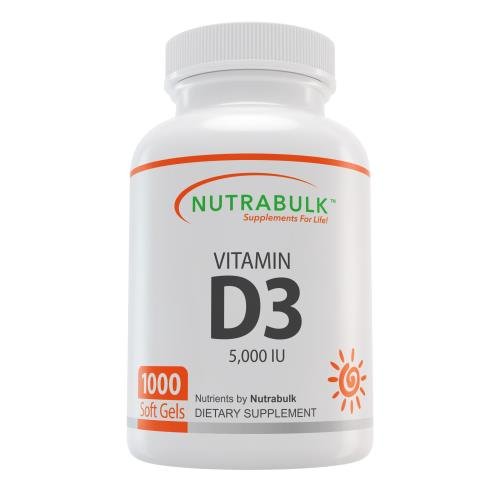 -. Feature : STAY HEALTHY WITH THE "SUNSHINE VITAMIN" - Vitamin D, produced naturally in the body when skin is exposed to sunlight, is essential for maintaining a number of important markers of health and wellbeing. Supplement with D-3 to ensure you meet the daily requirements, as it's estimated that 25-50% of the population may be deficient. / BULK BUY 5,000 IU SOFT GELS - NutraBulk's 5000 IU softgels provide fast, effective delivery of the highest potency vitamin D3 to the body. These capsules come in a large, long-lasting 1000 count bottle to save you money with a bulk buy. / SUPPORTS BONES, TEETH, IMMUNE FUNCTION & MORE - Vitamin D is well understood to support healthy bones, teeth, and immune system function. It also reduces inflammation in the body and helps maintain well functioning muscles. This supplement is perfect for adults, teens, men and women. / PURE, SAFE, ALL-NATURAL INGREDIENTS - Made with natural olive oil, this pure, high quality vitamin D3 comes in gel capsules that dissolve fast and are easy to swallow. Each cap is gluten free, soy free, and contains no artificial flavors, preservatives, sugar or lactose. / GMP CERTIFIED & BOTTLED IN THE USA - To ensure safety and quality, NutraBulk supplements are made using premium grade raw materials according to stringent manufacturing standards. These softgels have been third-party tested and are bottled and sealed in a GMP-certified facility here in the USA.