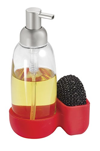 mDesign Glass and Silicone Kitchen Soap Dispenser Pump with Sponge or Scrubber Caddy Organizer- Clear/Red/Brushed