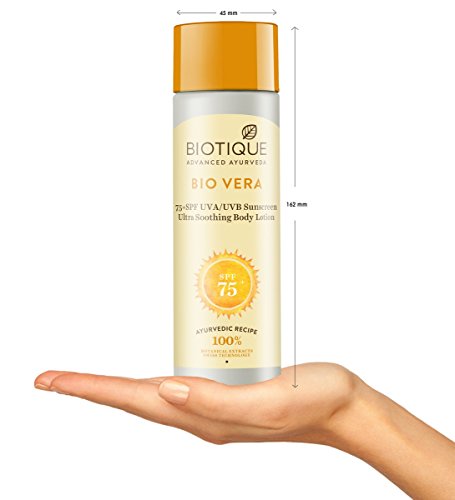 Biotique Aloe Vera Face & Body Sun Protection is an all natural Ayurvedic sun screen that is made with a blend of carefully selected oils and herbal extracts. Using a blended base of the oils of White Sandalwood, Sunflower, and Safflower, this sun screen is very nourishing and moisturizing to the skin. These oils are rich with essential vitamins and minerals, and are readily absorbed by the skin, so that this sun screen strengthens and protects the skin without leaving the skin greasy or oily. In addition, these oils reduce inflammation and irritation in the skin, helping to further protect the skin. Aloe Vera joins these oils to soothe and moisturize the skin, keeping it cool throughout long exposure to the sun, and leaving it soft and supple. Aloe Vera is naturally very healing to the skin, encouraging it to produce new cells. Biotique's Aloe Vera Face and Body Sun Protection lotion offers SPF 75 long lasting full spectrum protection from harmful UVA and UVB rays, keeping the skin safe while it nourishes and moisturizes it. Biotique - the beauty of nature - the essence of life.Feature