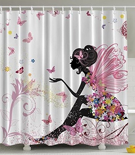 Pink Butterfly Girl With Floral Dress Flower Design Fairy Angel Wings Fae Home Accent Soft Colors Modern Designer Feminine Decor Dreamy Folklore Shower Curtain Black White by Vandarllin£¨TM)