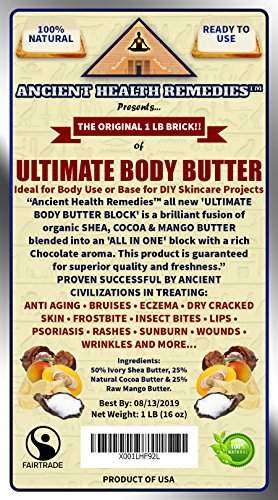 Buy Ancient Health RemediesTM Lowest Priced-Best Quality Shea, Cocoa and Mango, 'ULTIMATE BODY BUTTER BLOCK' with Amazon's 'Satisfaction Guarantee' allowing you to purchase with confidence and free Prime shipping. Ancient Health RemediesTM all natural. superior quality Organic ULTIMATE BLOCK has proven to be clinically effective in treating Acne, Anti-Aging Skincare, Arthritic Joint/Muscle Pains, Babies Rash, Bruises, Chapped Lips, Cuticle/Nails Fortification, Cuts, Dandruff, Dark Spots, Dry, Damaged Skin and Feet, Eczema, Ethnic Hair, Dermatitis, Frostbite, Hemorrhoids, Hair Treatment, Insect Bites, Nasal Congestion, Outer Viral Infections, Psoriasis, Razor Burns, Red Itchy Skin, Stretch Mark Prevention, Scar Prevention on Fresh Wounds, Stretch Marks, Sunburn Relief, Tattooed Skin, Weak Hair/Scalp, Wrinkles and Much More. This ALL IN ONE Body Butter Block is also the best choice on the market for Handmade and Industrial Manufacturers of Organic Skincare Products. Best All Natural Ingredient Base for All-Natural Cosmetics, Anti-Aging Cream, Babies Care Products, Beauty Products, Body Massage Oils, Body Lotion Making, Body Moisturizers, Handmade Body Butter Moisturizers, Healing Salves, Lip Balms, Organic Skincare Beauty Products, Natural Hair Products, Organic Shampoo, Stretch Cream and Whipped Shea Butter Products. EVERYONE should use Ancient Health RemediesTM 'Ultimate' Body Butter Block for healthy, youthful and pleasant feeling skin with best of 3 worlds, Shea Cocoa and Mango Butter. Subtract the hassle of buying all 3 butters in your home lab with this fabulous trio. Our special combination is the best all natural, organic alternative to popular, chemical based. skincare creams commonly sold in stores. Try yours today...hassle free, money back guaranteed and best legitimate price on Amazon.com. From 'Ancient Health RemediesTM', a company dedicated to the research and manufacture of the most successful, organic ancient health remedies of all time.Feature