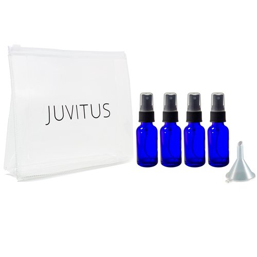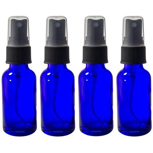 Cobalt Blue Glass Spray Mister Fine Mist Bottle - 1 oz (4 Pack) + Clear Travel Bag and Funnel