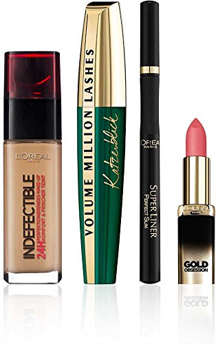 -. Feature : L'Oreal Paris Lippenstift Make-Up Color Riche Gold Obsession mit Gold-Effekt Glitzer Glitter Lipstick, 37 Pink Gold / L'Oréal Paris Super Liner Perfect Slim, Intense Black - ultra-präziser Eyeliner mit spezieller Filzspitze und einer intensiven, langanhaltenden Farbe, 1er Pack (1 x 2 ml) / L'Oréal Paris Volume Million Lashes Katzenblick Mascara, schwarz - Wimperntusche für extra Definition und extra wildes Volumen - 1er Pack (1 x 9 ml) / L'Oréal Paris Indefectible Make Up, 250 Radiant Sun - Make Up 24 Stunden Halt - optimal deckend & ultra-resistent gegen Talg und Schweiß, 1er Pack (1 x 30 ml)
