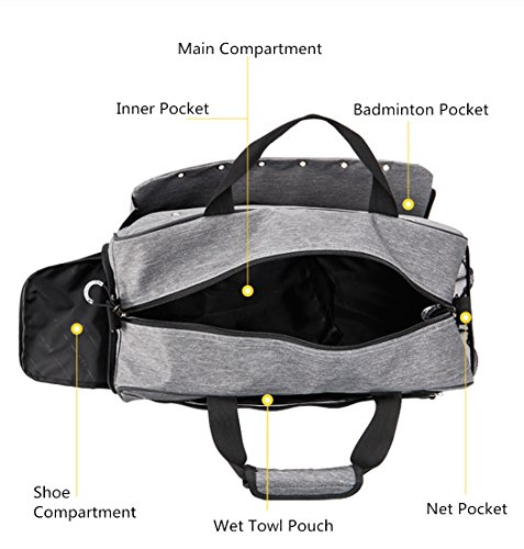 Duffel Bag Features: 1* main pocket for essentials. 1* inner zipper pocket for wallet,keys or cellphone. 1* inside zipper pocket for your shoes . 1* Zipper Pocket with Rope for slippers or Racket . 1* Waterproof zipper pocket for wet toiletries.