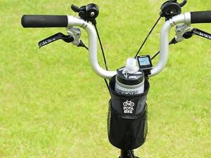 ●ボトルケージと違って柔らかいので、BROMPTONを折りたたみ時にもじゃまになりません。ぶつかっても柔軟に変形するので、装着したまま輪行袋をかぶせることができます。