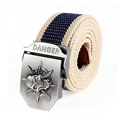Elife Blue & Khaki Men Alloy Skull Skull Buckle Canvas Waist Web Belt Waistband (Skull Blue & Khaki)