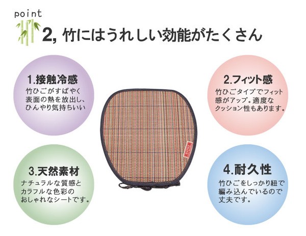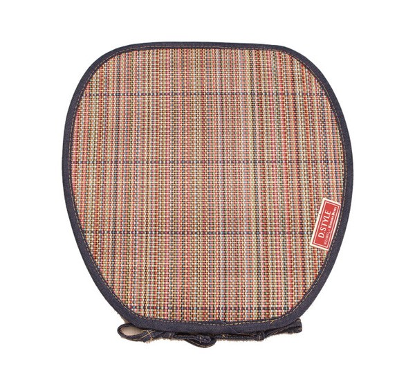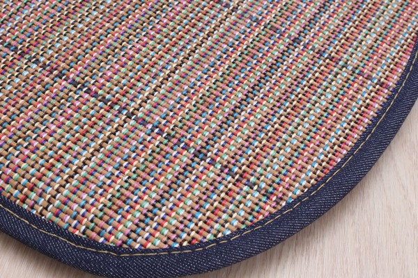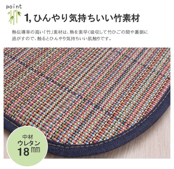 裏地、ヘリ部分に国産のデニム生地を使用したクッションです。インテリア商材なのでヘリ部分には色落ちしにくい加工を施しています。表地には細い竹ヒゴを使用しています。竹の素材感を残しながら、カラー糸によりデザインを表現しています。竹は耐久性に優れ、熱伝導率が高いため自然のひんやり感があります。中材にはウレタン18mmを使用していますので、適度なクッション性がありフローリングでのご使用にも適しています。※自然素材であること、また職人が一つ一つ手作業にて加工を行うため、形状のバラつきや表示サイズと多少異なることあります。ご了承下さい。