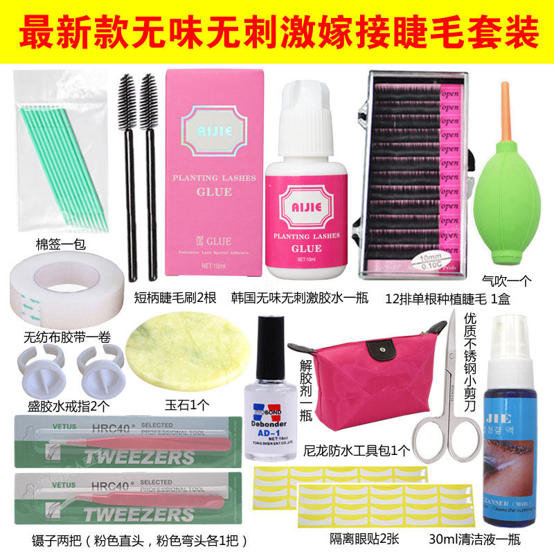 套装产品包括:韩国进口无味无刺激胶水1瓶,12排单根嫁接睫毛1盒,粉色直头镊子1把,粉色弯头镊子1把,工具包1个(颜色可以留言),AD-1解胶剂1瓶,胶水戒指2个,棉签1包,胶带1卷,短柄睫毛刷2根,气吹一个,隔离纸2张,不锈钢小剪刀一把,玉石1个,清洁液1瓶。
