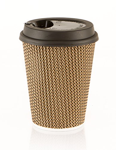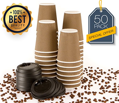 MyHomeIdeas Hot Insulated Paper Cups with Lids For Coffee Tea Espresso Latte - Ripple Insulated Eco Friendly Unspillable Sturdy Construction | Disposable Craft Large Reusable | 12 Oz / 50 Count