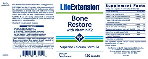Maintaining bone density and strength is about adding calcium. But it must be accompanied by adequate amounts of other vital nutrients. That’s why this proprietary, comprehensive mineral formula provides 700 mg of highly absorbable elemental calcium from three different forms, along with the critically important minerals magnesium, boron, zinc, manganese, and silicon, plus vitamins D3 and K2, needed for healthy bones. So try Bone Restore with Vitamin K2 and add all of these critical nutrients to your regimen with one bone-boosting formula!Feature