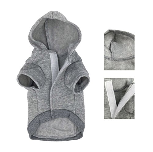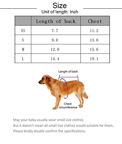 -. Feature : 4 sizes available:Extra Small Size (Length of back:8.6", Chest girth:12.2"); Small Size (Length of back:10.6", Chest girth:14.5"); Medium Size (Length of back:13", Chest girth:16.5"); Large Size (Length of back:15.3", Chest girth:20"). / Velcro closure on the front--Convenience for dogs to put on hoodies easily, especially for the dogs with big head and big chest, Velcro close easily to pull open in case the dog wants to urinate will not wet clothes. / Soft and comfortable-High quality fabric will not hurt dog's skin, fashionable and cute, keep warm. / Humanized design: there have 4 sizes available which can satisfied different size of dogs, like Chihuahua, Yorkie, French bulldog, Corgi, Schnauzer, Golden Retriever, Husky and so on. / Should compare with size chart before order the hoodies, in order to buy most suitable one for your lovely dog.