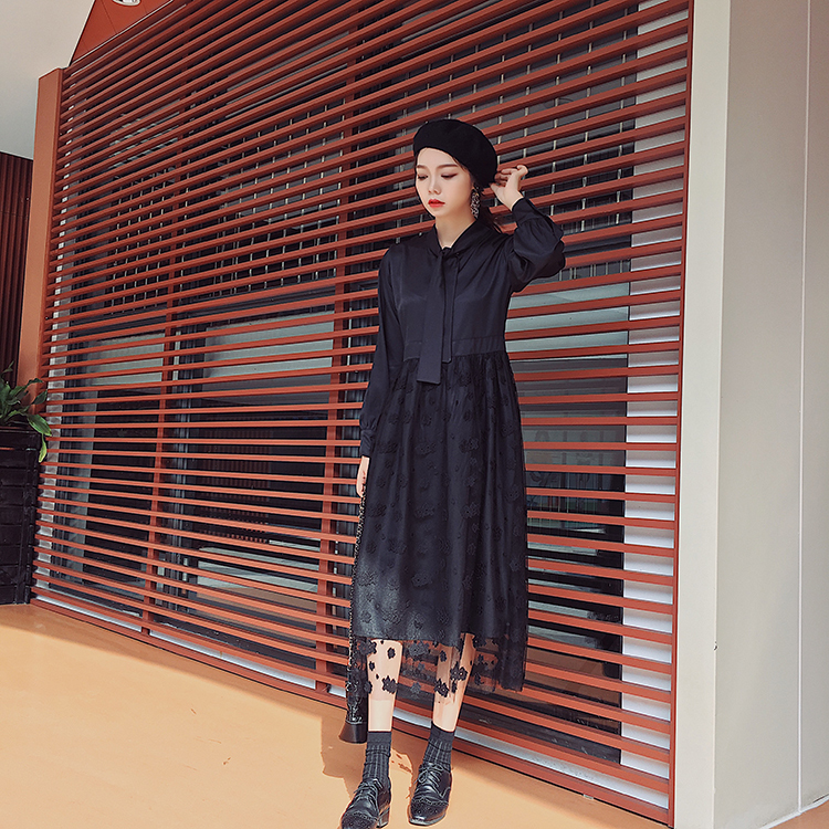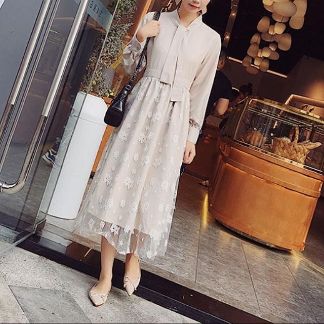 ボウタイシャツとレーススカートの切り替えしデザインがお洒落なワンピース♪