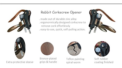 - This Rabbit Wine Corkscrew with Zinc alloy material, Bronze-plated handle, Rubber-coated finish plastic part,Stainless steel spiral with Teflon coating.