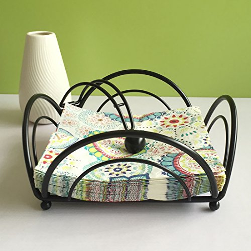-. Feature : Made of sturdy metal with ball feet and a black finish, creative and looks fashion. / Convenient hold arm with a big ball to ensure the paper in the rack, not blow away by wind / Perfect for place standard rectangle guest towels/banquet napkins, suitable paper size: 10-17cm/4-6.8"(Square Shape) / Keeps disposable paper napkins handy and clean for family and guests, also decorate your kitchen table, buffet, bar, or bathroom. / Decorative rectangle napkin holder organizes your kitchen table, buffet, bar, or bathroom