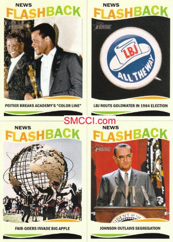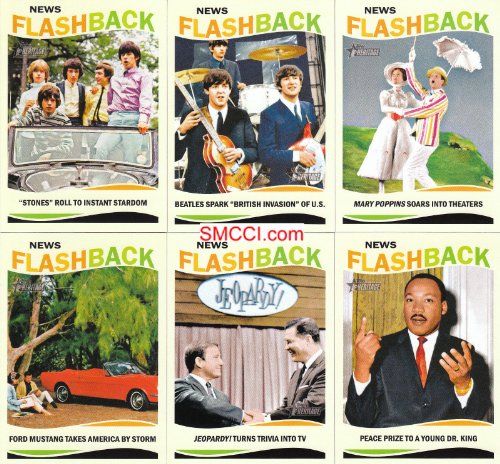 This is the 2013 Topps Heritage Baseball "News Flashbacks" complete mint 10 card insert set. Highlights 10 bigs news events and people from 1964 including The Beatles invasion, Civil Rights Act of 1964, Ford Mustang, Jeopardy, Lyndon B. Johnson, Dr. Martin Luther King, Jr., Mary Poppins, The Rolling Stones, Sidney Poitier and 1964 World's Fair.