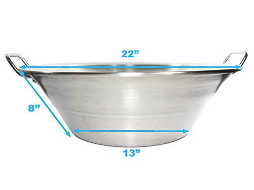 Purchase today this Heavy Gauge Stainless Steel to dish out authentic carnitas,mojarras,chicharrones,Quesadillas and more. This Cazo is designed for portable gas propane stoves and also has riveted handles that will give better Support and durability at the time of carrying heavy food.Dimensions 22"Top x 8"Deep x 13"Bottom