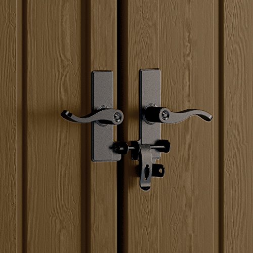 -. Feature : Constructed of durable double-wall resin with wood grain texture / Metal reinforced shingle style roof panels / Reinforced floor for heavier items / Lockable metal handles and metal hinges for strength and security / Transom windows and functional vents / Caution: Accessories listed in "Frequently Viewed/Purchased With" menu below do not guarantee compatibility with this item