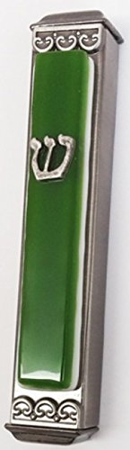 Handmade Glass on Metal Mezuzah Case and Cover, Moss Green