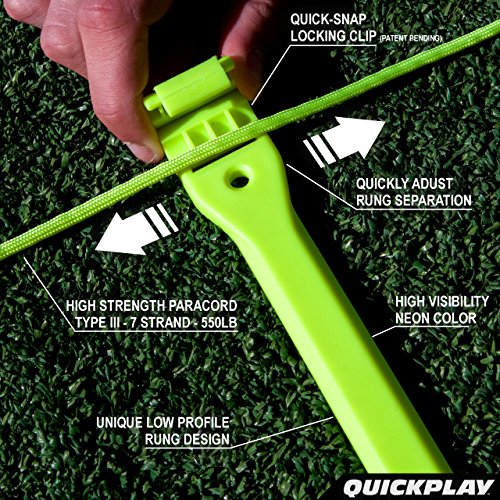 NO MORE TWISTED LADDERS – The QUICKPLAY PRO Agility Ladder uses 550lb, Type III, 7 strand Paracord. It’s not flat, so it can’t get twisted. BRIGHT NEON color provides superior visual acuity to black webbing ladders.