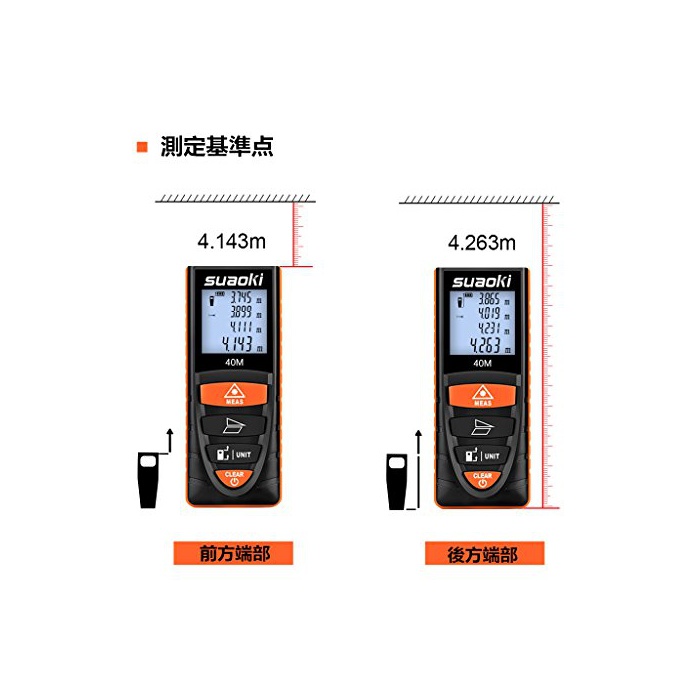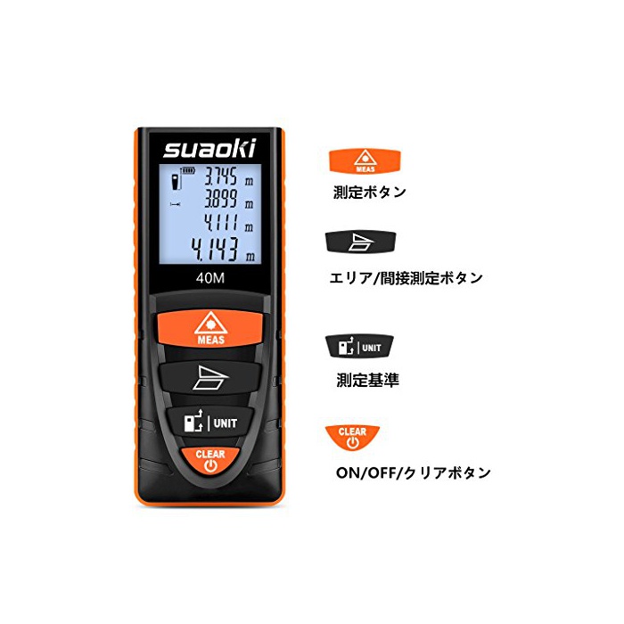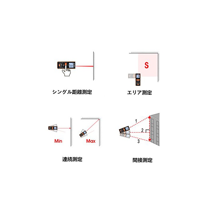 4종류의 측정 모드:싱글 거리 측정,연속 측정(최대 최소)고, 에리어 측정(주장면적)고, 간접 측정