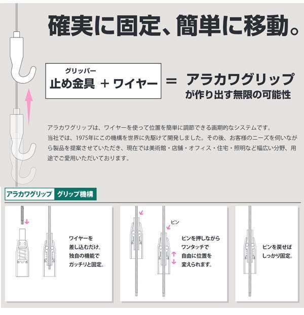 展示物等を直接支えるフックになります。シンプルかつ目立ちすぎないデザインで、ロングセラー商品です。フックにはずれ止めがついているので、耐震性等を重視される方にはおススメです。フックにはφ5.5mmまでの紐やロッドを掛けることができます。φ1.0~1.2mmのワイヤーを通して、ピクチャーレールやアタッチメント等とあわせて使用することで、商品棚やサイン・中軽量物のディスプレイができます。 |