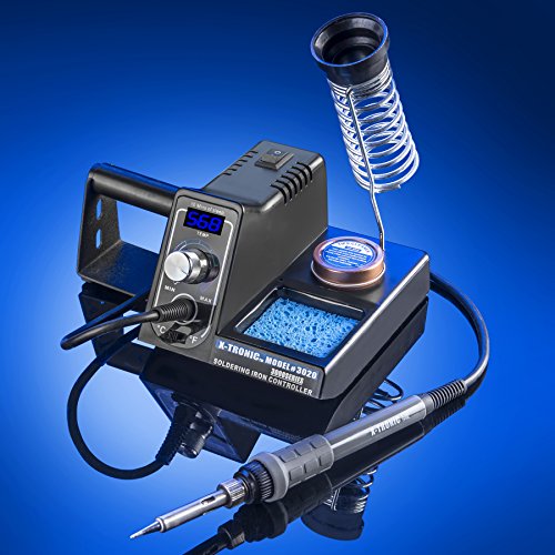 X-Tronic Model #3020-XTS Digital Display Soldering Iron Station - 10 Minute Sleep Function, Auto Cool Down, C/F Switch, Ergonomic Soldering Iron, Solder Holder, Brass Tip Cleaner with Cleaning Flux