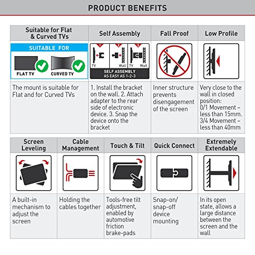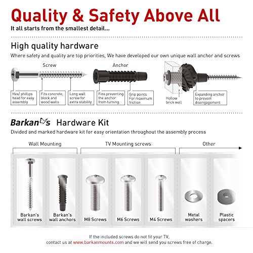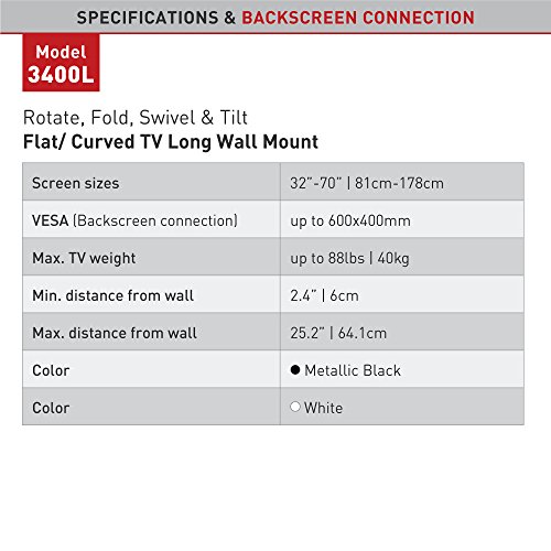 -. Binding : Electronics -. Brand : Barkan -. Color : Metallic black -. EAN : 0818212001049 -. Feature : Patented mechanism to fit both flat and curved screens / Extremely extendable / Quick Connection mechanism enables easy Connection and disconnection of the screen / Fall proof inner structure prevents disengagement of the screen. / Compatibility to larger screen size applies for TVs with weight capacity and VESA pattern specified below. -. Label : Barkan USA Inc -. Manufacturer : Barkan USA Inc -. Model : 3400L.B -. MPN : 3400L.B -. NumberOfItems : 1 -. PackageQuantity : 1 -. PartNumber : 3400L.B -. ProductGroup : Home Theater -. ProductTypeName : AV_FURNITURE -. Publisher : Barkan USA Inc -. Size : 70" -. Studio : Barkan USA Inc -. Title : Barkan Extremely Long Full Motion Curved/ Flat TV Wall Mount for 32" -70" Screens up to 88 lbs Metallic black (3400L.B) -. UPC : 818212001049 -. Warranty : Lifetime