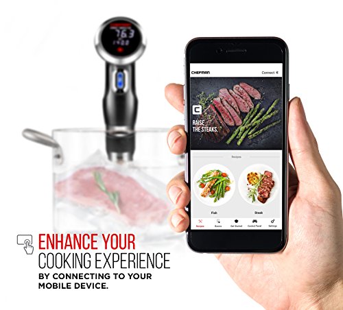 PRECISE TEMPERATURES FOR PERFECT RESULTS. With the Chefman Precision Cooker you can easily produce 5-star restaurant quality dishes using just a pot of water and food in a vacuum sealed bag. Chefman Sous Vide helps home chefs master underwater cooking with submerged circulation technology that precisely controls the water temperature, ensuring meals from steak to fish, veggies and eggs never go above the perfect internal heat level, resulting in a succulently juicy, evenly cooked dish that is guaranteed to impress family & friends alike. Long the domain of professional chefs and serious foodies, Sous Vide is finally accessible to the everyday consumer with the Sous Vide by Chefman. The master of underwater cooking, this precision cooker has advanced even heating technology that keeps water at the precise temperature needed for succulent Sous Vide results, locking in juices, flavor, and preserving the nutritional quality of food with incomparable taste and texture. Perfectly cooked steaks, juicy chicken, fall-off-the-bone ribs and vibrant veggies are just a few of the possibilities accessible with just the push of a button. The Sous Vide is also known as Suvide Cooker, or Suvid Machine for the French style of cooking. Download the Chefman Sous Vide App and connect your precision cooker directly to your phone or tablet, making the experience even more simple and seamless. Included in the app are step-by-step guided recipes, temperature guides, how-to videos, tips, and more, making Sous Vide cooking easier than ever!Feature