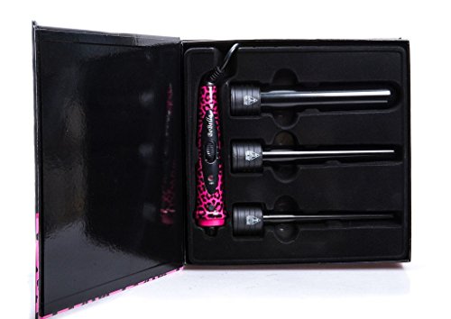 Bebella 3p 3 in 1 Professional Clipless Hair Curler Curling Iron System with 3 Interchangeable Tourmaline Barrels with Heat Resistant Glove (Pink Leopard)