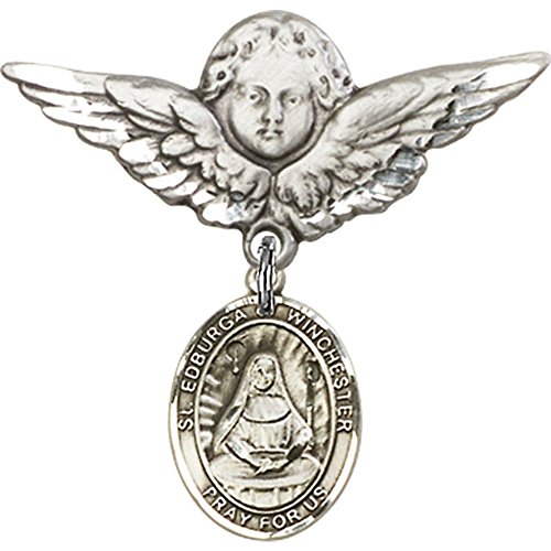 -. Title : Sterling Silver Baby Badge with St. Edburga of Winchester Charm and Angel w/Wings Badge Pin 1 1/8 X 1 1/8 inches