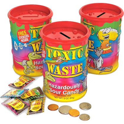 -. Feature : Super cool toxic waste tie dye candy coin bank / Filled with some seriously hazardous sour candy in assorted flavors / Individually wrapped pieces / Includes free stickers inside each bank / This is a pack of THREE coin banks - 3 oz each