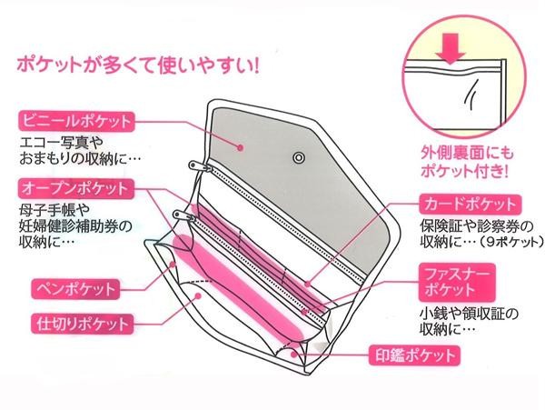 妊婦健診補助券や保険証などもまとめて収納!!様々なポケットが付いていてとっても便利です。