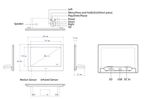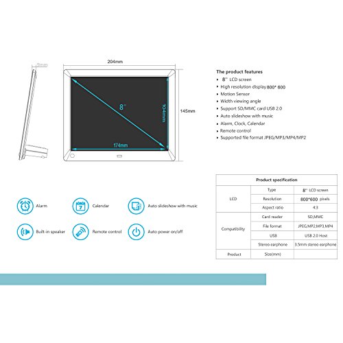 -. Binding : Electronics -. Brand : SSA -. EAN : 0602766176144 -. Feature : Motion Sensor : Turns the frame on when you enter the room and off when you leave the room / USB & SD/SDHC Card: Plug and play to Instantly display all your digital photos. It's that easy. / 8 inch High Resolution 1280x768 (4:3) LED Backlit Display, can play photos (JPEG) , videos (MPEG-4/AVI). / Auto Rotate Sensor and Split Screen Image Option, Full 1 Year Warranty / Great gift idea. Full customer service including file and video compatibility advice -. Label : SSA ELECTRONIC -. Manufacturer : SSA ELECTRONIC -. Model : ZN-DP801 -. MPN : ZN-DP8002 -. PartNumber : ZN-DP8002 -. ProductGroup : CE -. ProductTypeName : DIGITAL_PICTURE_FRAME -. Publisher : SSA ELECTRONIC -. Studio : SSA ELECTRONIC -. Title : 8 inch Digital Photo Frame with Motion Sensor High Resolution Digital Picture Frames 1280*768 IPS LCD -. UPC : 602766176144