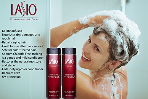 Infused with keratin and UV protectants, LASIO Color Treated Shampoo cleanse without fading color. Lasio Hypersilk Color Treated Shampoo contains a blend of natural oils, amino acids, vitamins and protective antioxidants that provides shine. This fade-defying conditioner will lock in moisture and shine without compromising your color.