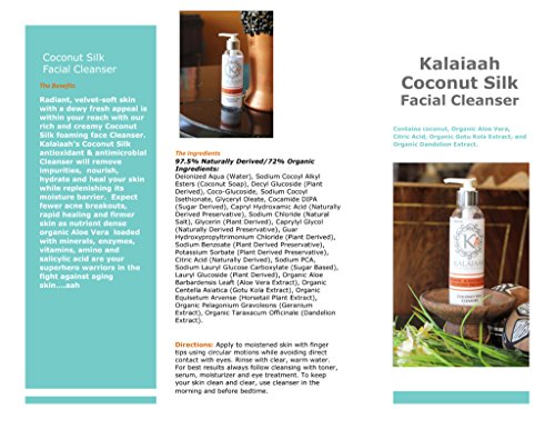 -. Feature : Kalaiaah ORGANIC & NATURAL Foaming Face Wash is Skincare AWESOMENESS is MADE in USA state-of-the-art QUALITY CONTROLLED lab with ENVIRONMENTAL FRIENDLY packages & "old world" customer service. We are a HIGH-END SKINCARE brand with laser focus on QUALITY & FAIR P.R.ICES. / Our Natural Antioxidant Foaming Face Wash of Coconut, Aloe & Citrus gives a-DEWY Finish & HEALTHIER SKIN. Rich & creamy cleanser will remove impurities, deeply nourish, heal & hyper-oxygenate your skin. / AGE DEFYING Aloe Vera, a dermatologist favorite and one of our BEST HEALING & NOURISHING "go to" ingredients has over 75 ENZYMES, MINERALS, VITAMINS & amino acids and will slow down the "aged look" and seems to TURN BACK THE HAND OF TIME. Proven. / ANTIOXIDANTS in Coconut Oil are warriors against aging skin. The ANTIMICROBIAL properties of Coconut Oil Acids BLOCK & MINIMIZE ACNE. The oil of the coconut is charged with dirt & dead skin clearing & its nutrients NATURALLY HYDRATE & FEED your skin. No artificial fragrances! / EXPECT: healing & nourishing ORGANIC & NATURAL SKINCARE AWESOMENESS! No toxins, or animal by products, but GREAT QUALITY & P.R.ICE. Enhance your body with SIMPLY THE BEST SKINCARE INGREDIENTS. SATISFACTION is GUARANTEED or return for your money back!