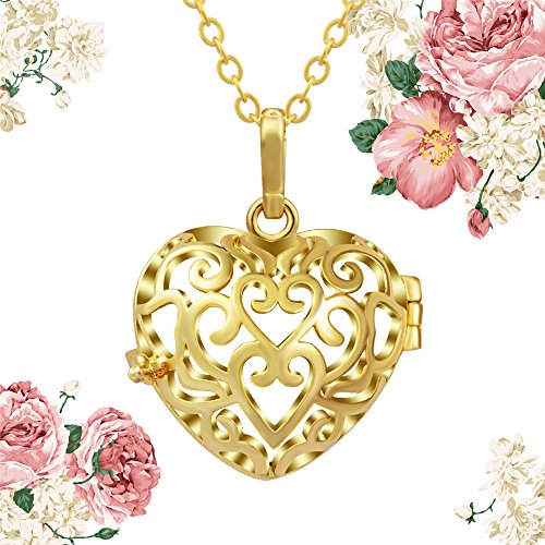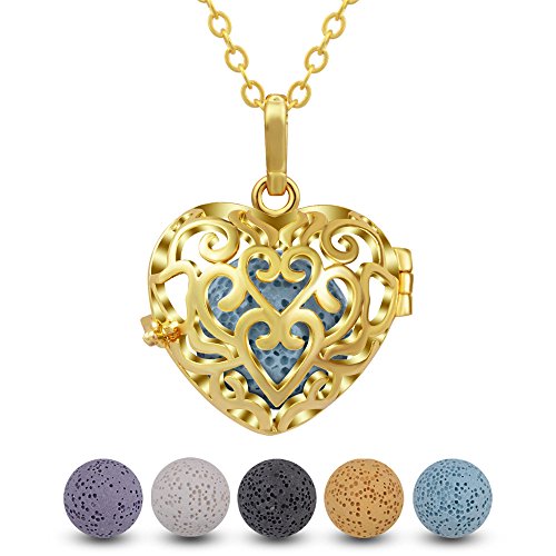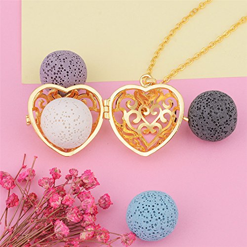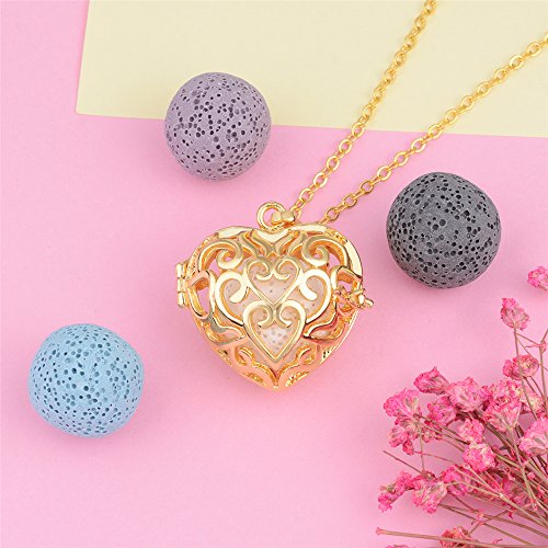 Aromatherapy Essential Oil Diffuser Necklace Locket Pendant + 5PCS Natural Lava Stone Rock Beads + Adjustable 30" Long Chain Gold Tone Cloud of Love Pattern for Women Scent Infuser Jewelry