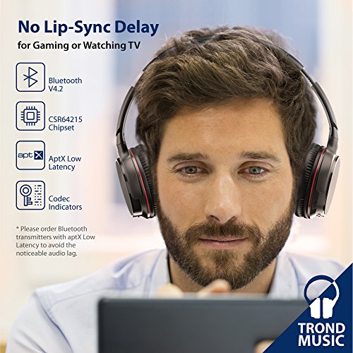 Studio : TROND Publisher : TROND Binding : Electronics Product Description Wireless Over-Ear Headphones, Specially Designed for TV Watching No Noticeable Audio Delay With CSR 64215 chipset, TROND TD-BH01 is one of the few headphones in the market which truly support aptX Low Latency and allow you to watch video without any noticeable audio delay (approx. 30~40ms latency ONLY). Please order TROND BT-DUO series Bluetooth transmitter to avoid any lip-sync issues. Smart Codec Indicator There're many Bluetooth transmitters or headphones which falsely advertise the concept of "low latency". TROND TD-BH01 reveals the truth to you, by displaying different indicators for different codec: blue for SBC, blue red for aptX, blue green for aptX Low Latency. Balance of Performance and Comfort Our headphones feature the extra-large 500mAh battery capacity (many others with 300-400mAh only), less than 7.6oz total weight and enlarged earmuffs made of smooth artificial protein leather, all of which allow you to enjoy long hours of audio listening. Specifications: - Model: TROND TD-BH01 - Bluetooth Compliance: CSR64215, Bluetooth V4.2, Class II - Profile: A2DP, AVRCP, HFP - Codec: aptX Low Latency, aptX, SBC - Working Range: up to 33ft / 10m - Speaker: Φ40mm dynamic speakers - Microphone: Φ6*5mm, omni-directional - Battery: 500mAh / 3.7V - Working Time: 20-30 hours, depending on different usage - Standby Time: up to 20 days - Charging Time: 2-3 hours, 5V/1A - Earcup Size: outer - 9.8 * 8cm; inner - 5.8 * 4cm - Net Weight: 7.58 oz / 215 g Remarks: - All the volume/track buttons as well as the microphone only work in the wireless mode, and are not active in the wired mode. - If you experience the intermittent sound in the wireless mode, please press the volume /- buttons simultaneously for 5 seconds to reset the headphones.