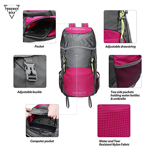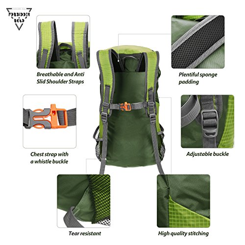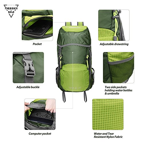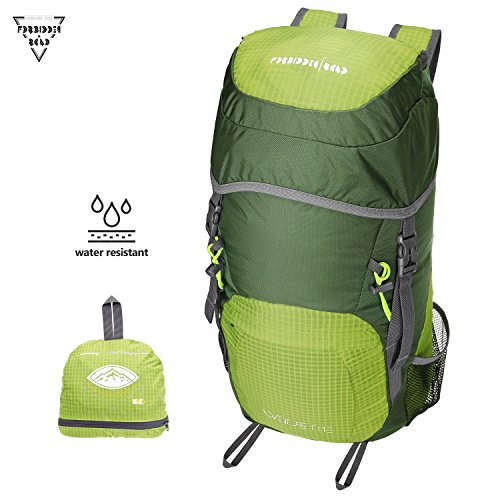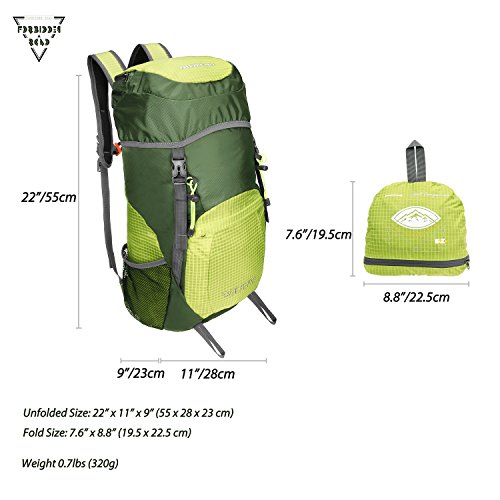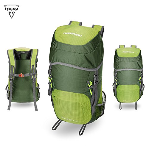 -. Brand : Forbidden Road -. Color : Green -. Feature : LIGHTWEIGHT AND FOLDABLE The hiking backpack weighs 0.7lbs (320g), super lightweight, will not cause additional pressure to men and women hikers. The original size of the hiking daypack is 22" x 11" x 9" (55*28*23 cm), could be folded much smaller 7.6" x 8.8" (19.5 x 22.5 cm). Just fold the camping backpack to be a small handbag and carry it anywhere. / LARGE STORAGE The main bag of the hiking backpack designed with a 35L capacity, which could store many hiking and camping items such as clothing and shoes for outdoor, outdoor aid kit, iphone, keys , camera and more. Besides, two side pockets are good for holding water bottles and umbrellas. No matter for outdoor hiking or just for daily use, this foldable backpack is a nice choice. / WATER AND TEAR RESISTANT The outdoor backpack adopts quality Nylon Fabric which has great water resistance features. Hikers or campers no need worry the hiking daypack or items in the backpack may get wet. Besides, the camping backpack is quite tear resistant, not easy to be broken. The travel backpack always provide extra strength and long-lasting performance with the lightest weight. / BREATHABLE AND ANTI SLID SHOULDER STRAPS The outdoor daypack use breathable mesh shoulder straps with plentiful sponge padding help relieve the stress from backpackers shoulder. The length of the shoulder straps is adjustable. The chest strap with a whistle buckle help lock the backpack in place securely. / PACKAGE Hiking backpack X1 -. IsAutographed : 0 -. IsMemorabilia : 0 -. Label : Forbidden Road -. Manufacturer : Forbidden Road -. MPN : ROAD-FRB143 -. PartNumber : ROAD-FRB143 -. ProductGroup : Sports -. ProductTypeName : OUTDOOR_RECREATION_PRODUCT -. Publisher : Forbidden Road -. Size : 22" x 11" x 9" (55*28*23 cm) -. Studio : Forbidden Road -. Title : Forbidden Road Hiking Backpack Daypack 35L 0.7lbs Ultralight (3 Colors) Foldable Water Resistant Nylon for Camping Climbing Trekking Backpacking Travel Outdoor