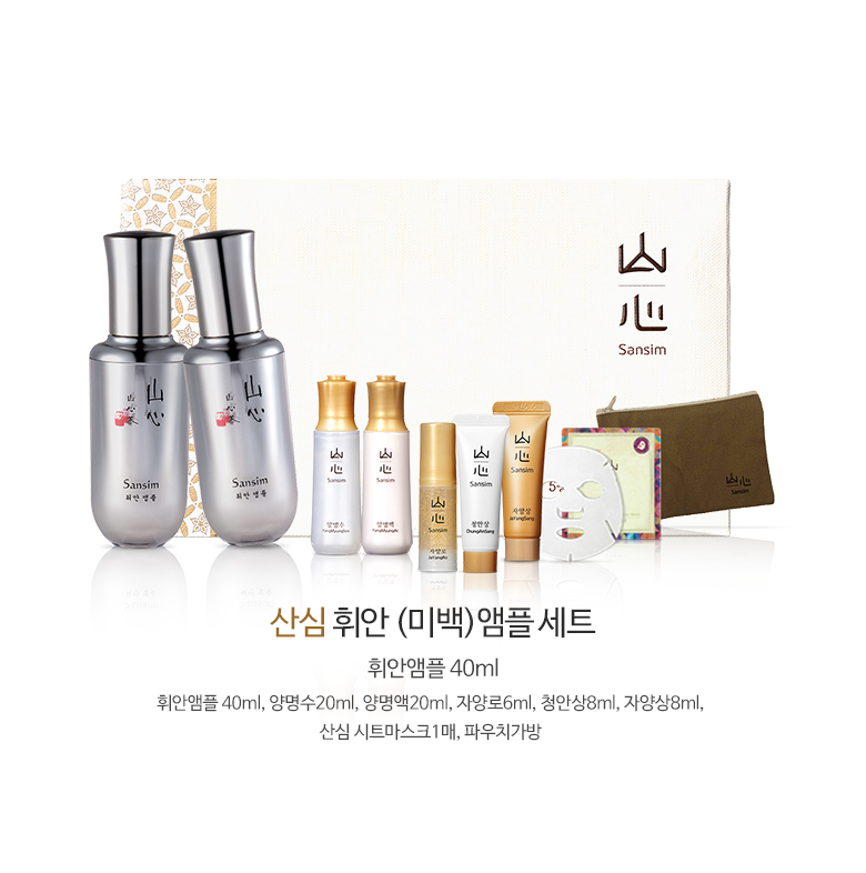 휘안앰플 더블세트 [본품]휘안앰플40ml [증정]휘안앰플40ml(정품), 양명수20ml, 양명액20ml, 자양로6ml, 청안상8ml, 자양상8ml, 산심 시트마스크1매, 파우치가방 3가지 한방 미백 성분이 노화에 따른 기미, 잡티를 다스려 주어 투명하고 환한 피부로 가꿔주는 한방 에센스 *한국화장품의 독자 성분으로 기미, 잡티를 다스려 환하게 가꿔주는 한방 스팟 에센스- *표면 케어
