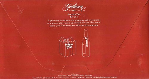 Studio : Gorham 1831 Publisher : Gorham 1831 Binding : Health and Beauty Product Description Gorham 1831 Christmas Package Ties/Ornaments - Each package contains a set of five ties/ornaments. Made of silver metal in script-style writing, with the following sentiments: CELEBRATE, HOHOHO, MERRY, PEACE JOY, and JINGLE! A great way to enhance the wrapping and presentation of a gift or to dress up a bottle of wine for gift giving! Also use to adorn your Christmas tree with special sentiments! 0