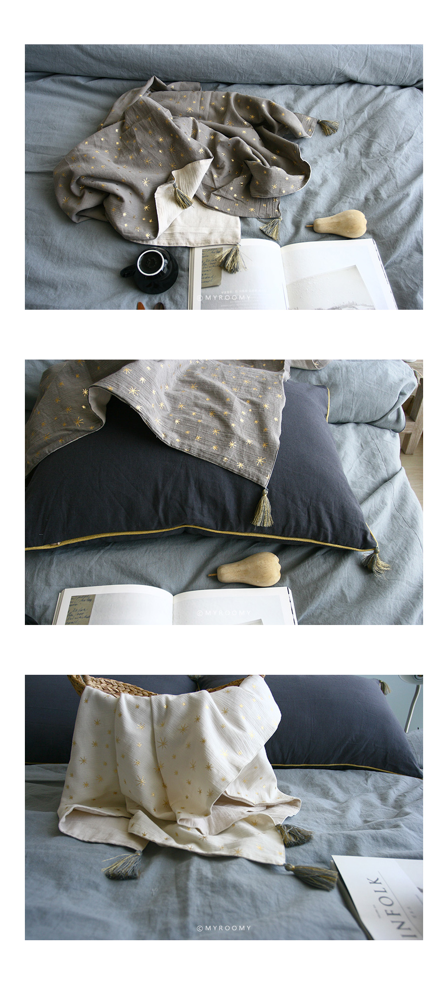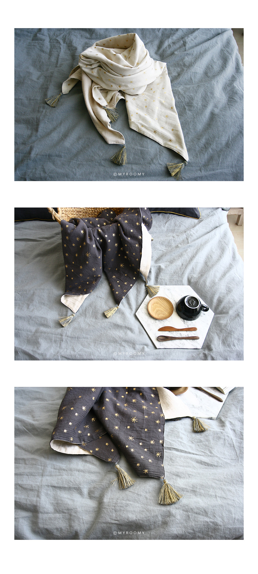 | *주문 제작 상품으로 제작이 들어간 후에는 취소하실 수 없음을 양해부탁드립니다. *세탁 유의사항을 꼭 참고해주세요. *제품 수령일까지는 최소 일주일~10일정도 소요되는 제품입니다. *모니터의 해상도에 따라 실제 제품의 색상과 조금 달라보일 수 있습니다. *제품 상세설명 부드러운 촉감 좋은 거즈 원단에 블링블링 예쁜 골드스타 패턴의 블랭킷입니다. 햇살이나 조명에 따라 은은하게 반짝이는 스타 패턴과 태슬이 너무 고급스럽습니다. 윗면은 리플가공한 1중 거즈, 뒷면은 리플가공한 2중거즈로 제작하여 총 3중 거즈 제품으로 포근한 느낌이 듭니다. 아기들은 유모차 블랭킷, 낮잠이불 용도로 매우 훌륭해요. 특히 유모차 위에 펼쳐서 올려주면 한층 더 유모차가 고급스러운 느낌이 듭니다. 성인들은 쌀쌀한 날씨에 무릎담요로 사용해도 좋고, 숄처럼 살짝 어깨에 둘러도 좋습니다. 소재, 디자인, 활용도등 어느것 하나 빠지지 않는 블랭킷이에요~ 원단 특성상 손으로 세게 비벼빨거나 세탁조에 바로 넣어 세탁시 반짝이는 예쁜 골드스타 패턴이 손상될 수 있습니다. 꼭 세탁망에 넣어 조심히 세탁해주세요. 고온 세탁도 안되어요~~ 세탁부주의로 인한 교환 환불은 안되니 유의해주세요. *제품 상세정보 <<사이즈>> 85*140 170*140 <<구성>> 85*140 170*140 <<색상>> 아이보리에 골드스타 패턴/ 태슬: 그레이와 골드 혼합 그레이베이지에 골드스타 패턴 / 태슬: 그레이와 골드 혼합 딥그레이에 골드스타 패턴 /태슬: 그레이와 골드 혼합 <<재질>> 앞: 1중 리플 거즈 뒤: 2중 리플 거즈 <<제작>> made by myroomy <<세탁>> 세탁은 중성세제, 절대 손으로 비벼빨면 안되며, 세탁망에 넣어서 세탁해주세요.ㅣ 울코스로 40도이하 단독 물세탁 권장합니다. |
