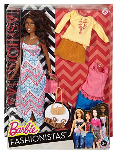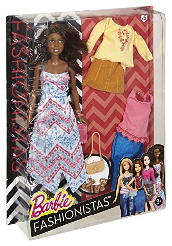 Each Barbie Fashionistas doll has her own look and style -- from casually cool to boho bold, all fashions are inspired by the latest trends, and with two additional complete outfits the styling fun is endless! With added diversity and more variety in styles, fashions, shoes, and accessories, kids everywhere will have infinitely more ways to spark their imaginations and play out their stories! Includes Barbie Fashionistas doll wearing fashion and shoes, two additional complete looks (a dress and/or top and bottom), a second pair of shoes, two purses, and one accessory. Each sold separately, subject to availability. Dolls cannot stand alone. Clothing is designed to mix and match with dolls of the same body type; select pieces can be shared across the line. Flat shoes fit dolls with articulated ankles or flat feet. Colors and decorations may vary.Feature