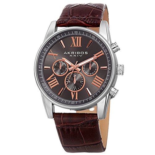 -. Title : Akribos XXIV Men's Swiss Quartz Multi-Function Silver-Tone Case with Grey Sunray Dial and Brown Alligator Embossed Genuine Leather Strap Watch AK911SSBR