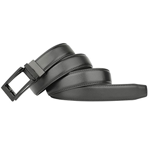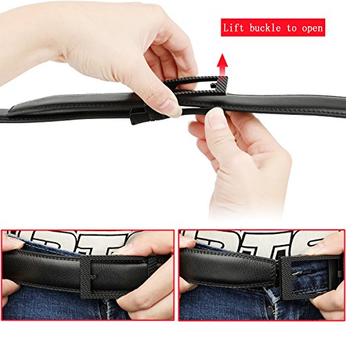 [Easy To Use]: Slide in the strap to tighten and the belt auto locks. Lift the buckle and pull to release. Quite easy to tighten and release. Special designed for men in dress suit, uniform and jeans.