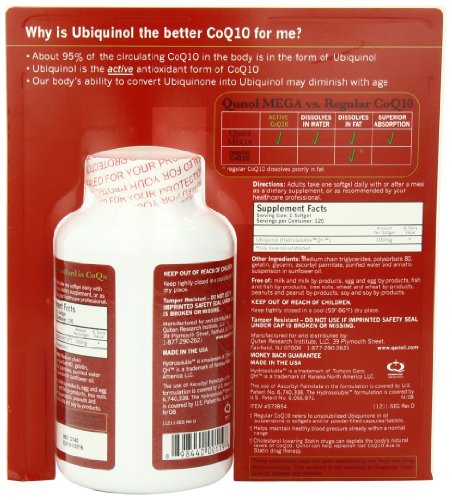 -. Binding : Health and Beauty -. Brand : Qunol -. Feature : Superior absorption / Supports heart and vascular health / Promotes healthy blood pressure levels / Essential for energy production / Beneficial to statin drug users -. IsAdultProduct : 0 -. Label : Qunol -. Manufacturer : Qunol -. PackageQuantity : 1 -. ProductGroup : Health and Beauty -. ProductTypeName : HEALTH_PERSONAL_CARE -. Publisher : Qunol -. Studio : Qunol -. Title : Qunol - Mega CoQ10 Ubiquinol 100 mg. CoQ10 is a vitamin-like nutrient that plays a vital role in the energy production in every cell in our body. Our body naturally produces CoQ10 and converts ubiquinone to ubiquinol. However, our body's ability to produce CoQ10 and convert it into ubiquinol significantly decreases as we age. Ubiquinone CoQ10 is the active form of CoQ10 - approximately 95% of the CoQ10 circulating in our body is in the form of ubiquinol. As we age, our body's ability to produce ubiquinone and convert it into its active form of ubiquinol diminishes significantly. Advanced ubiquinol is both water and fat soluble, unlike regular unsolubilized ubiquinone that dissolves in fats only and to a very limited degree.
