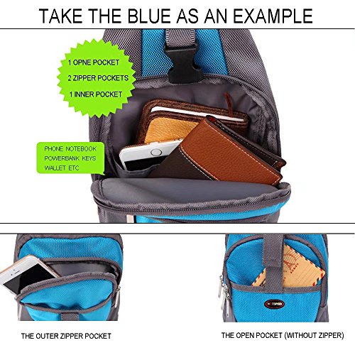 -. Feature : Anti-Stolen: Sling bag will provide more safety (anti-stolen) for your personal effects than backpack, you will keep eyes on those effects easily / Enough Space: There are two zippered compartments with an inner pouches eusure enough space for your need as much as possible / Universal: Perfect for carrying phone, purses, keys, first aid gear,pills, energy bars, power bank, camera, portable charger, umbrella etc / Lightweight: It only 0.4lbs, widely used for running, hiking, cycling, camping, jogging, walking the dog, shopping and other one day trips / Unbalance: It's flexible, not only can be used as a chest pack but also shoulder backpack, messenger bag or fanny pack, there are two hooks on the bottom that allow you to choose left or right side to carry
