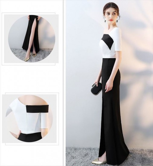 バイカラーのロングワンショルダードレス。