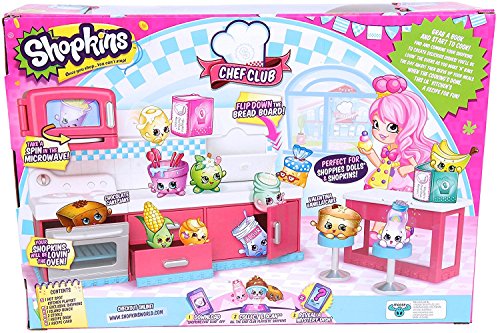 Get cooking in the Chef Club Kitchen! The Shopkins are ready to make and bake. Take the Shopkins for a spin in the microwave. Cook up a treat in the oven. Pop down the surprise breadboard for a slice of the good life! Store your recipe books on the shelf and Shopkins in the cupboards and drawers. Display your Shopkins on the two stools and the cake stand! The kitchen play set comes with 2 Exclusive Shopkins and 2 recipe books! This Chef Club playset connects with other Chef Club Plays sets to create the Chef Club Kitchen!Feature