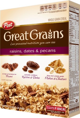 -. Binding : Grocery -. Brand : Great Grains -. Feature : Great Grains Raisins, Dates, & Pecans / 31g of Whole Grain per Serving / 20% of your Daily Value for Fiber (5g of fiber per serving) -. Label : Great Grains -. Manufacturer : Great Grains -. ProductGroup : Grocery -. ProductTypeName : GROCERY -. Publisher : Great Grains -. Studio : Great Grains -. Title : Post Selects Great Grains Raisin, Date & Pecan Cereal